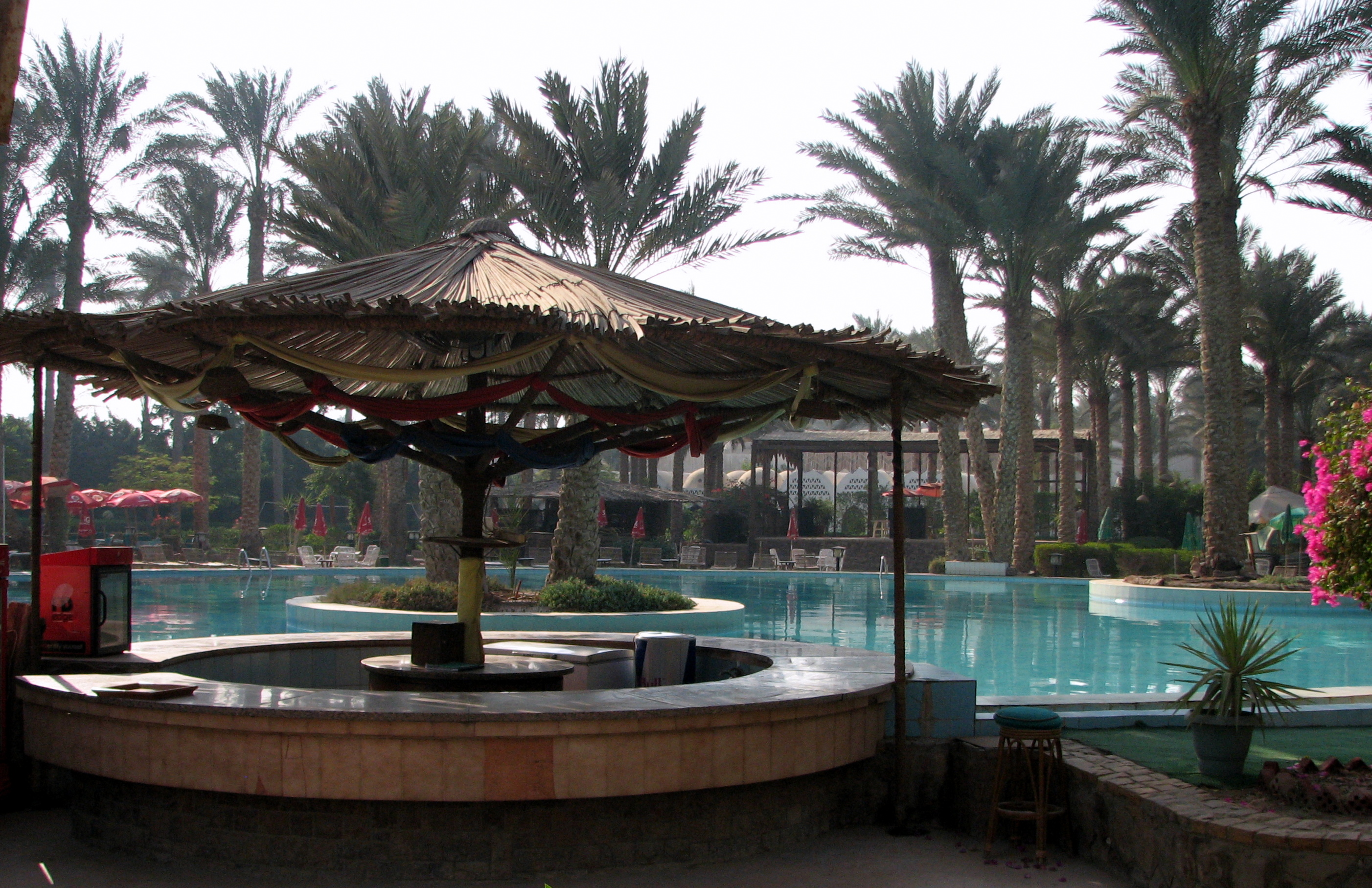 After visiting the Step Pyramid it was around 2 pm and very hot. When our air-conditioned bus stopped and we were asked to step outside, I did not want to leave and face the heat again. But we had no choice, we were going to have lunch. Following our tour guide we went towards a door which looked like the entrance to a monastery.But  it was not a monastery. It was more like an Oasis, with lush vegetation, beautiful flowers, and the most beautiful swimming pool surrounded by palm trees.