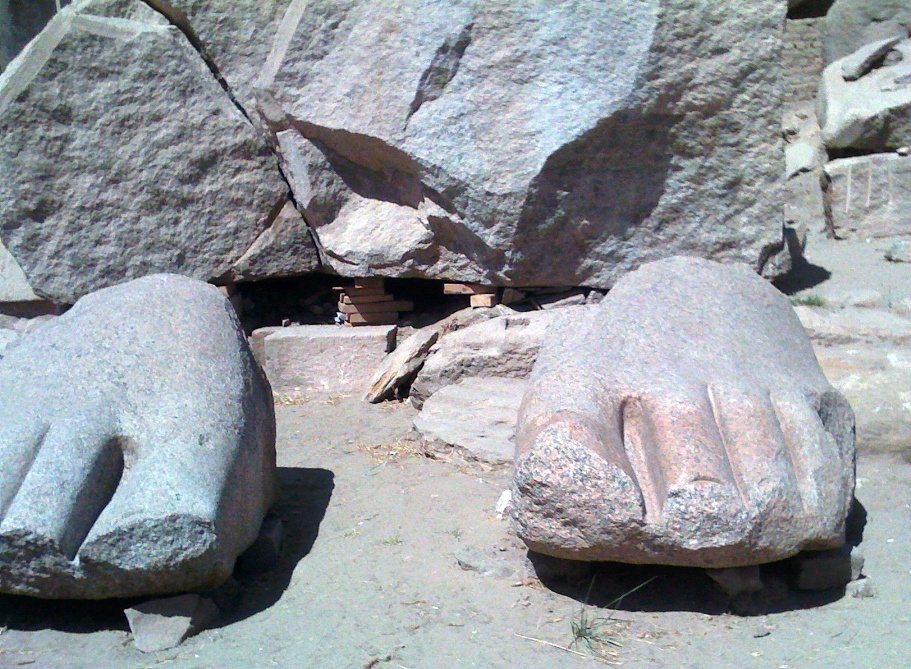 The feet are part of a broken statue of Ramses II – which stood at the Ramesseum, on the West Bank of the Nile, near Luxor.