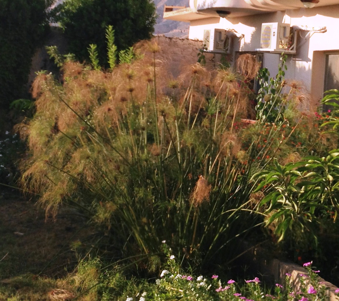 While visiting the Nefertary Papyrus Institute, Mohamed, the brother of the owner showed me how papyrus is made – and with the following pictures I am happy to share this experience with you. – First we went to his garden to look at the papyrus plant. It is a fuzzy looking bush with brush-like flowers shooting out of solid long stems.