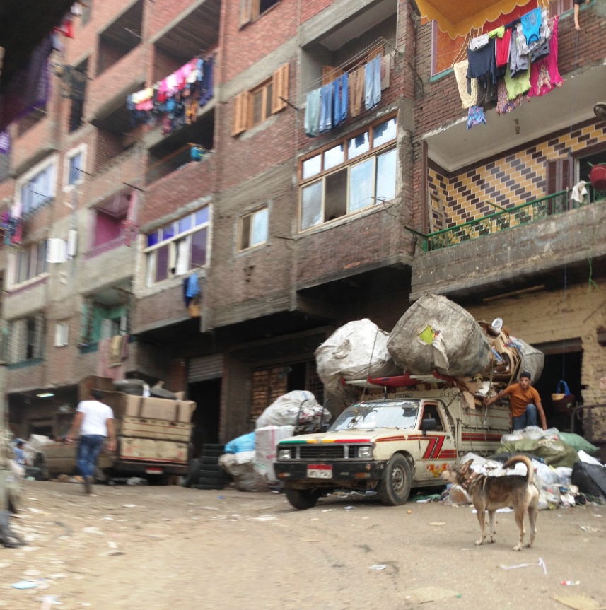 The garbage city is on the base of Mokattam Hill on the outskirts of Cairo. Its people make their living by collecting and recycling Cairo’s garbage. The city has streets and shops and apartments, but it lacks infrastructure and often has no running water.