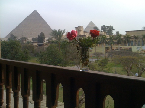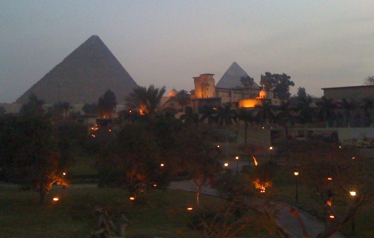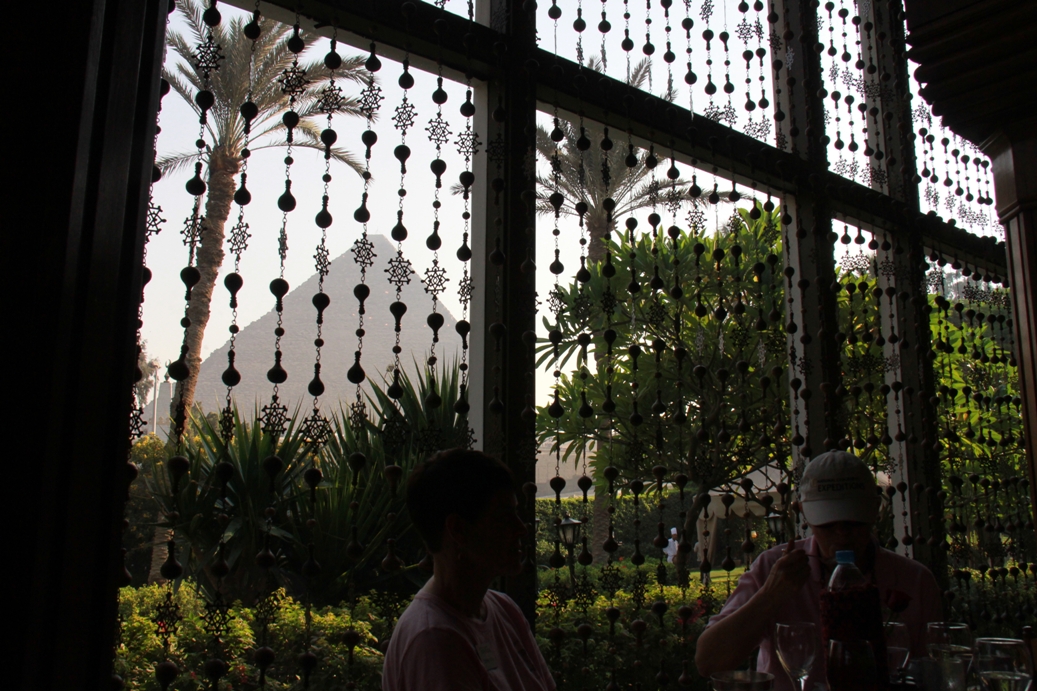 Every time somebody mentions the Mena House, or I see a picture of it somewhere,  my heart stops a little – why?  Because two years ago I spent 5 nights  there. No, I am not famous or rich, but when I booked my second tour to Egypt in 2012, staying at the MENA HOUSE had been one of my requests. And I was lucky. Maybe my luck was due to the drop in  tourism, the result of the revolution in 2011 and the continues unrest. Maybe having fewer guests made them welcome mere mortal like me. From the balcony of my room –  there –  very close by, stood the Pyramids – I saw them in the morning mist, in bright sunlight, and at dusk, before they disappeared for the night.