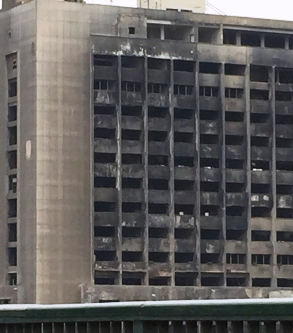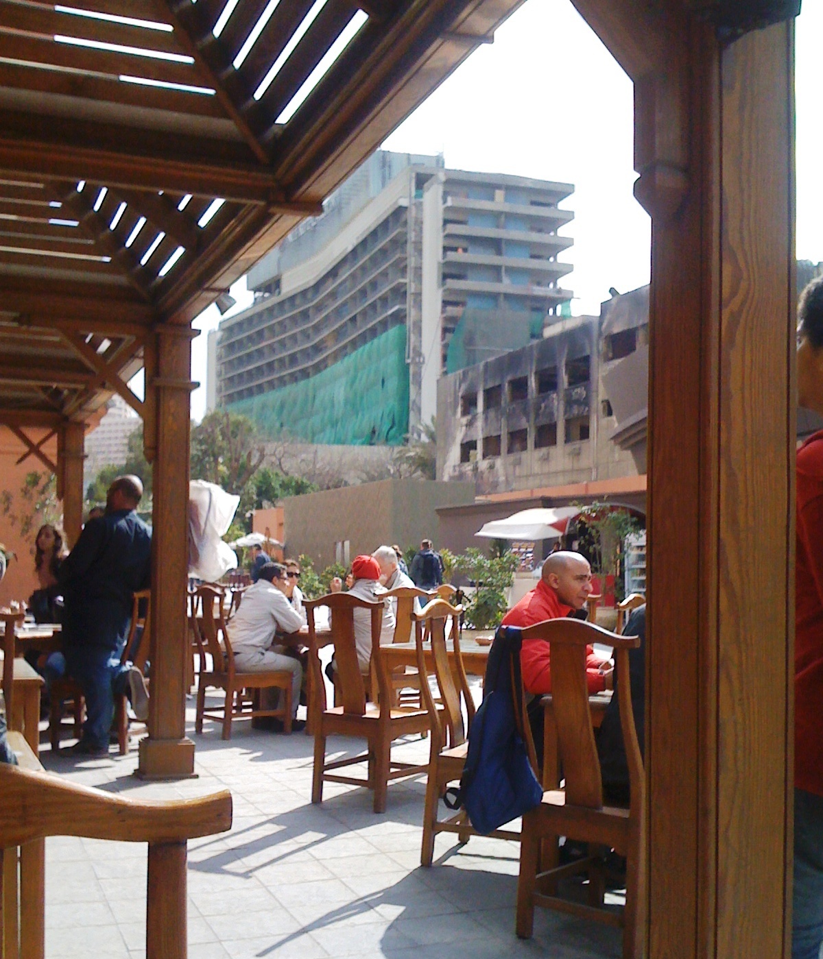 It towers over the Nile and the Egyptian Museum close by – so close that when tourists enjoy a cup of coffee in the restaurant of the Museum the blackened, dark holes look down on them.