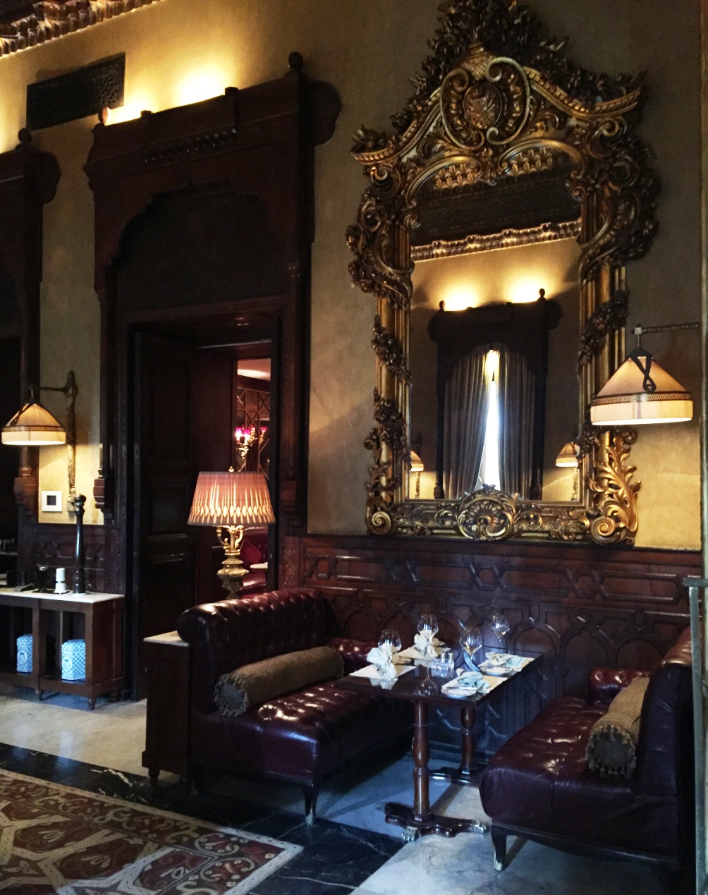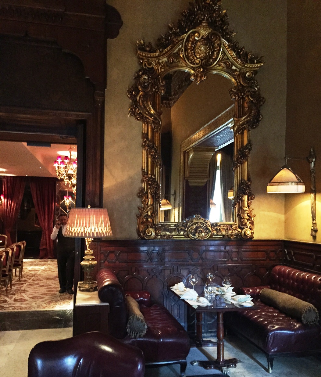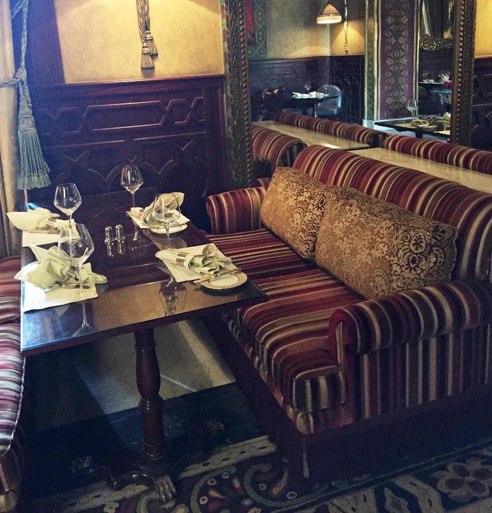 But I digress – let’s go back to the Saraya Gallery. Walking in it feels like becoming part of One Thousand and One Night. The marble floors are covered with luscious , thick carpets, the leather or tapestry covered banquettes are soft and welcoming, and all is bathed in a discreet, warm glow from oriental lamps, accentuating the luxury of the furnishings.