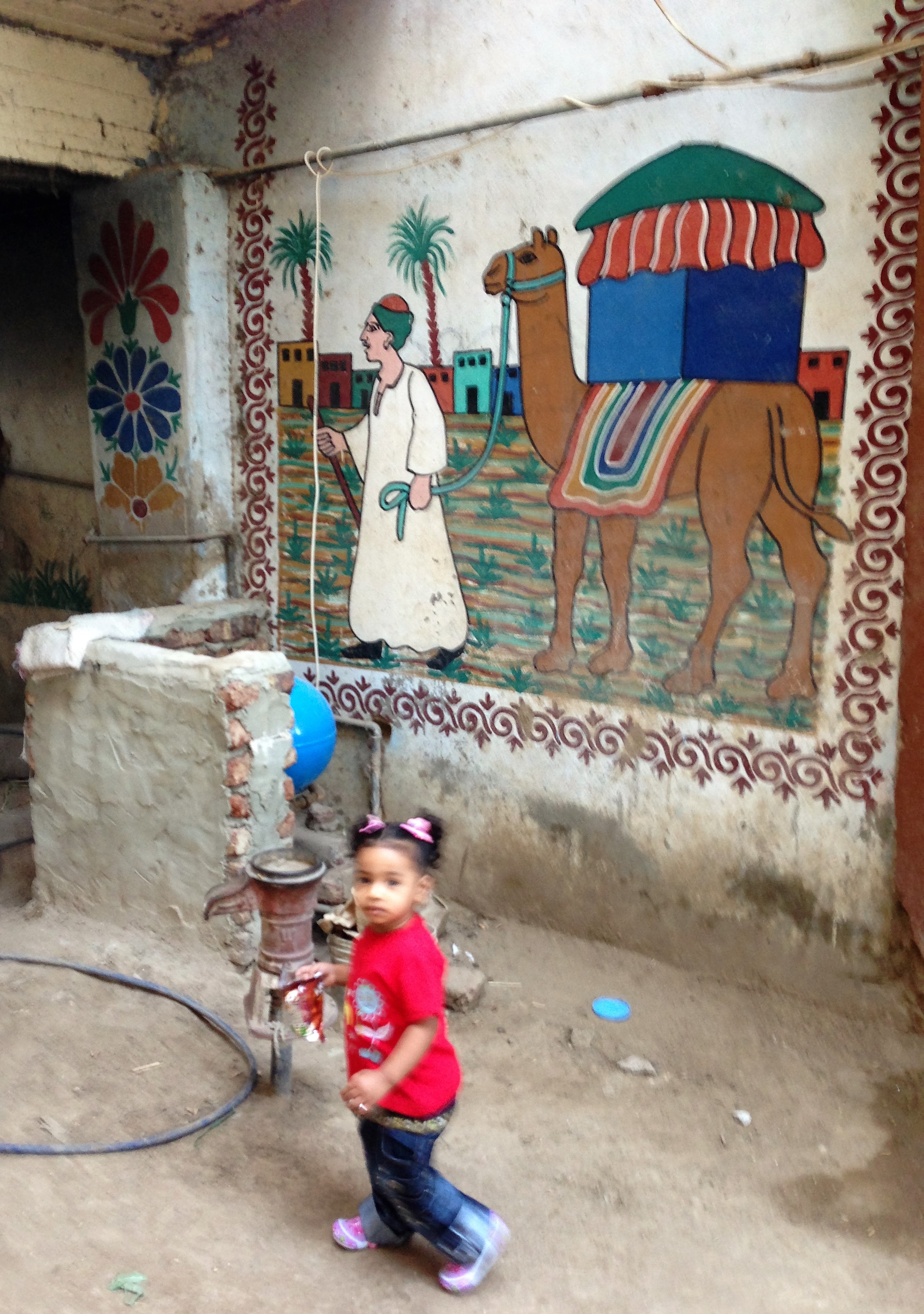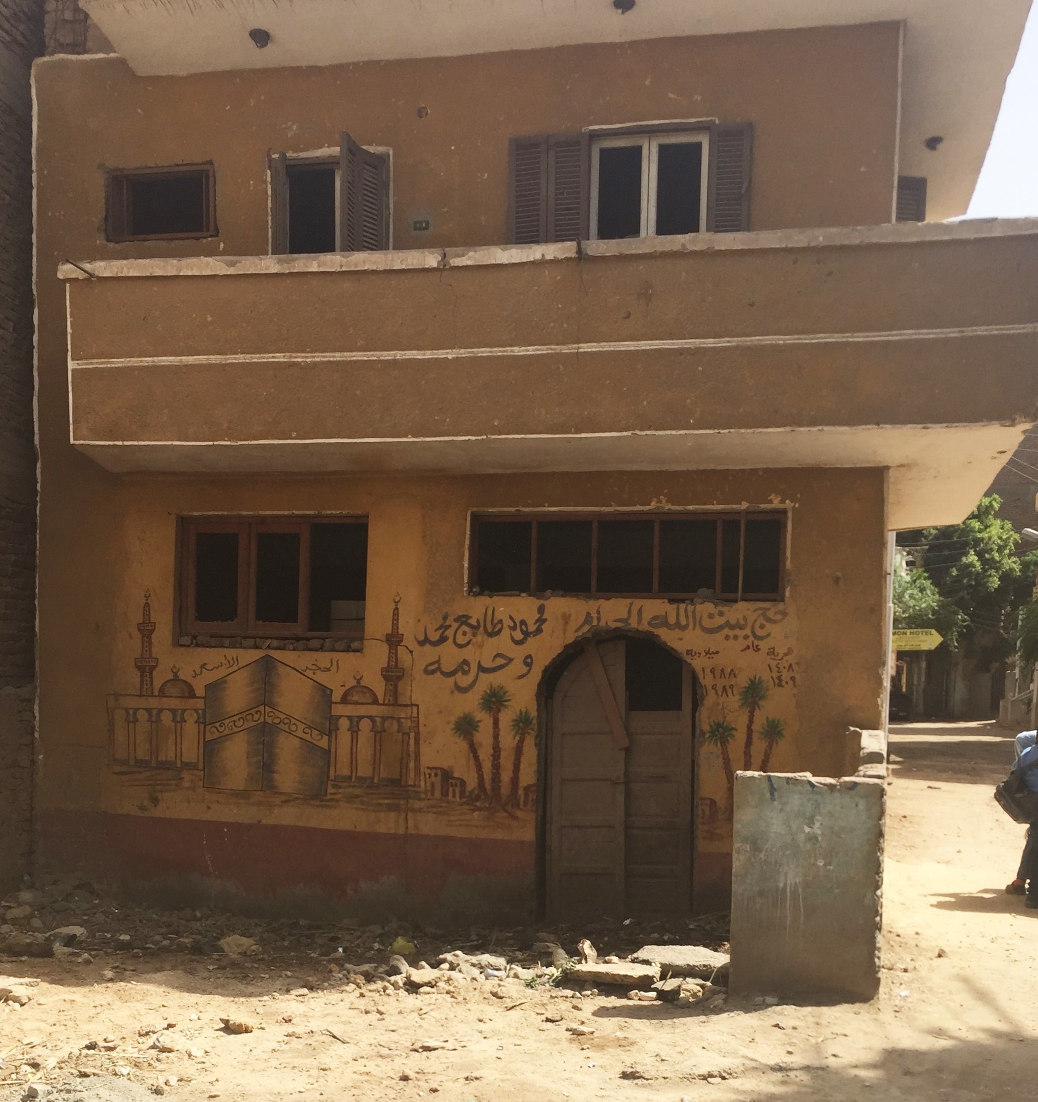 It is the tradition to commemorate this journey by decorating the outside walls of the returning pilgrim’s house. These  images  are of airplanes, cruisers, animals and scenes from Mecca. A practice which today is followed more  in the country side of Upper Egypt than in big cities like Cairo or Alexandria.