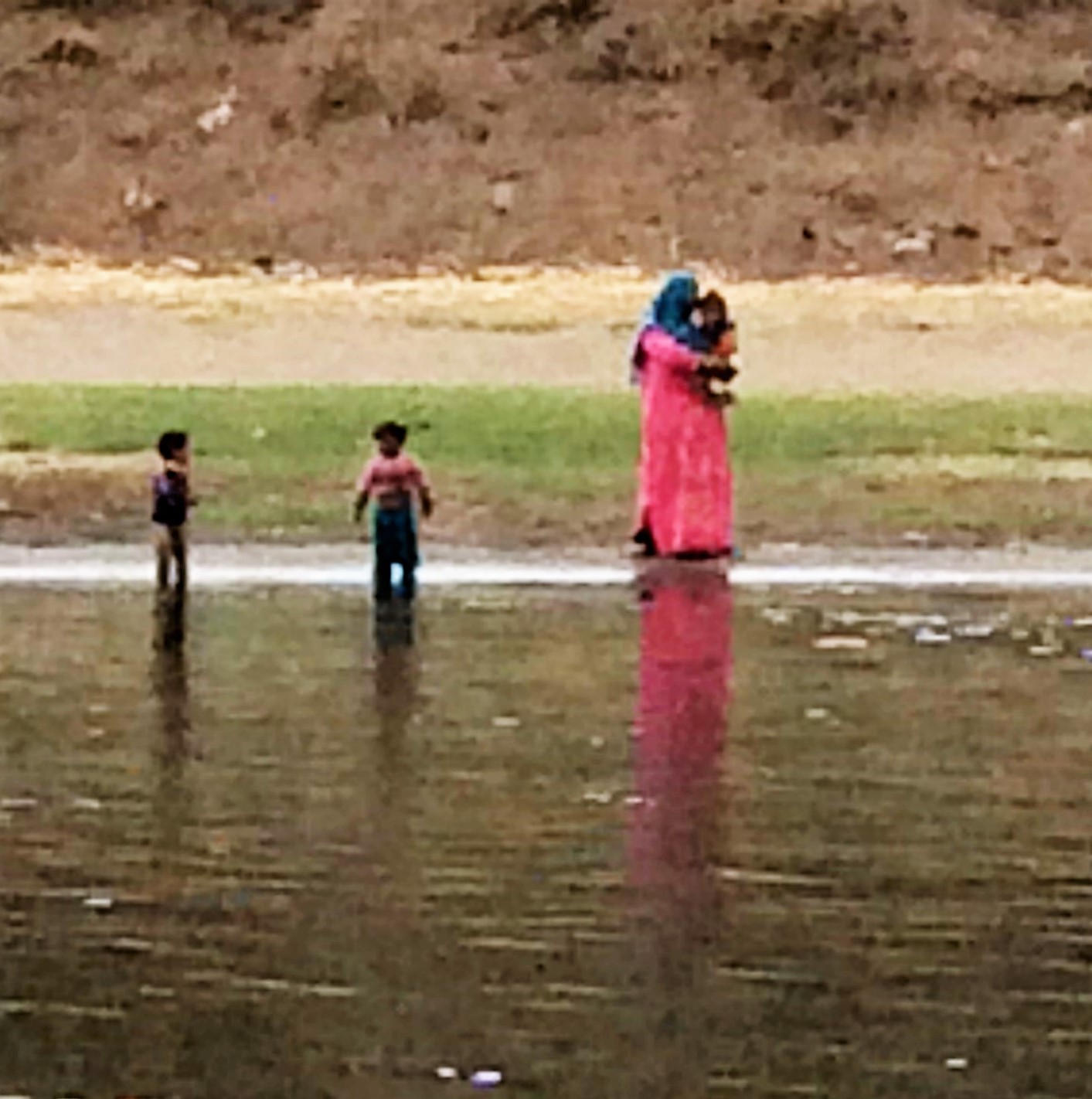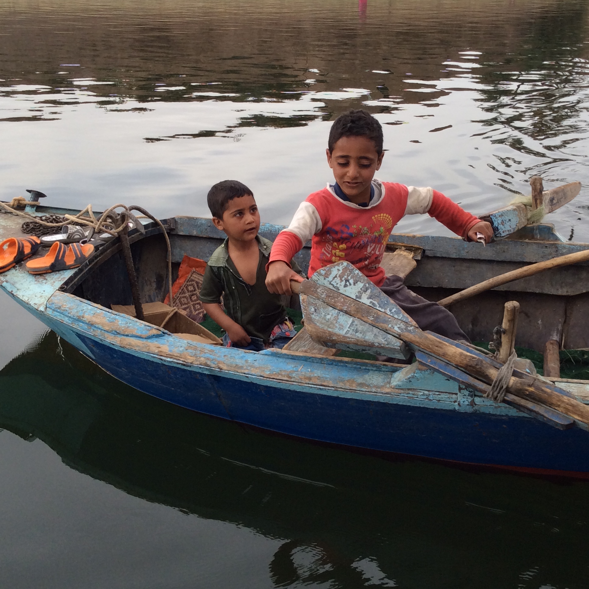When this mother standing on the banks of the Nile saw our boat come closer she send her two boys in a rowing boat to meet us and offer us some fruit and a few trinkets .