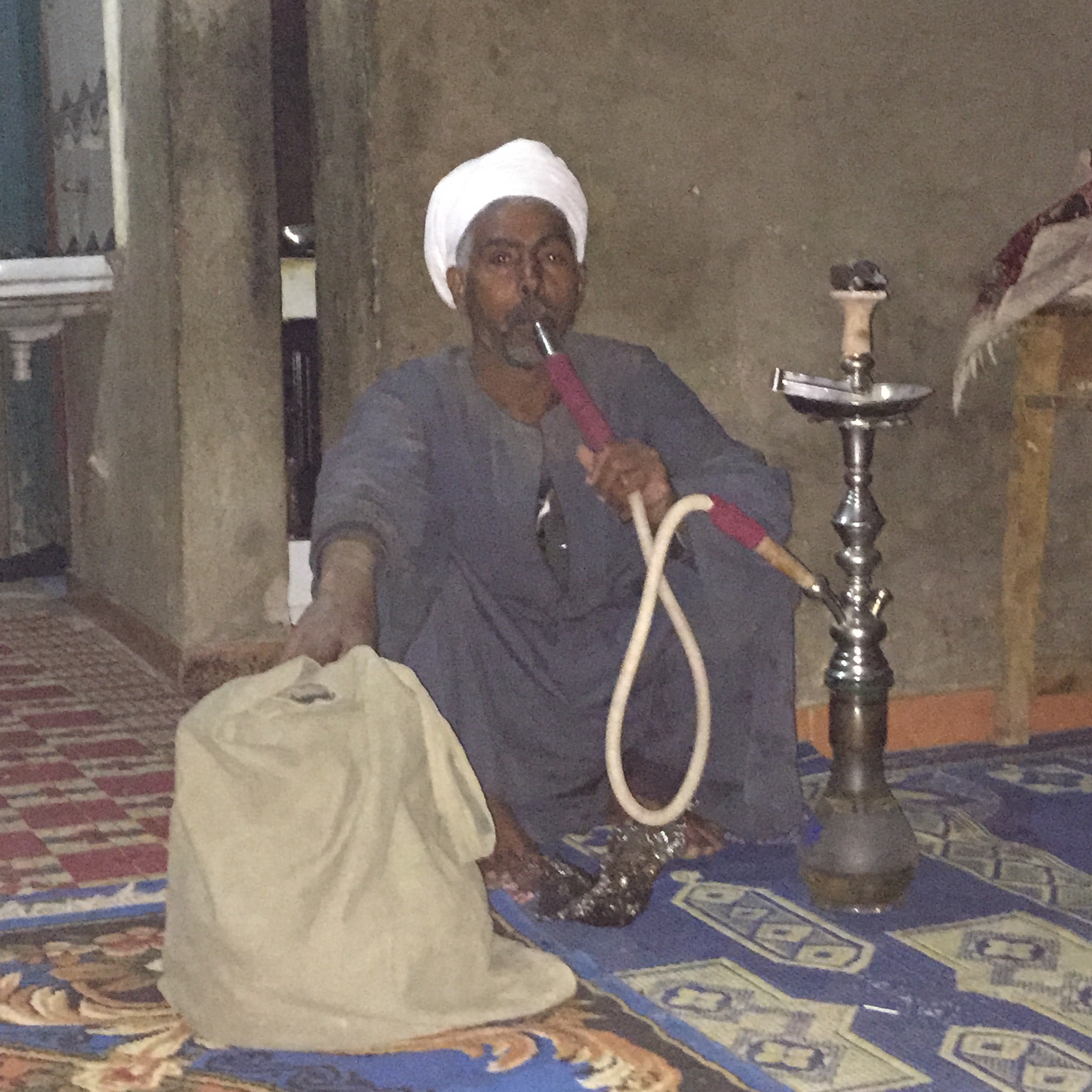 Ahmed pointed  to the man sitting against the wall smoking a hookah (waterpipe) and told us that he was our man. Moments later a jute bag was brought in and placed in front of him. Putting his hand on it, he started chanting- we held our breath – the cobra was close………..but there was no need to hold our breath – what he pulled out of the bag was an ordinary garden snake.